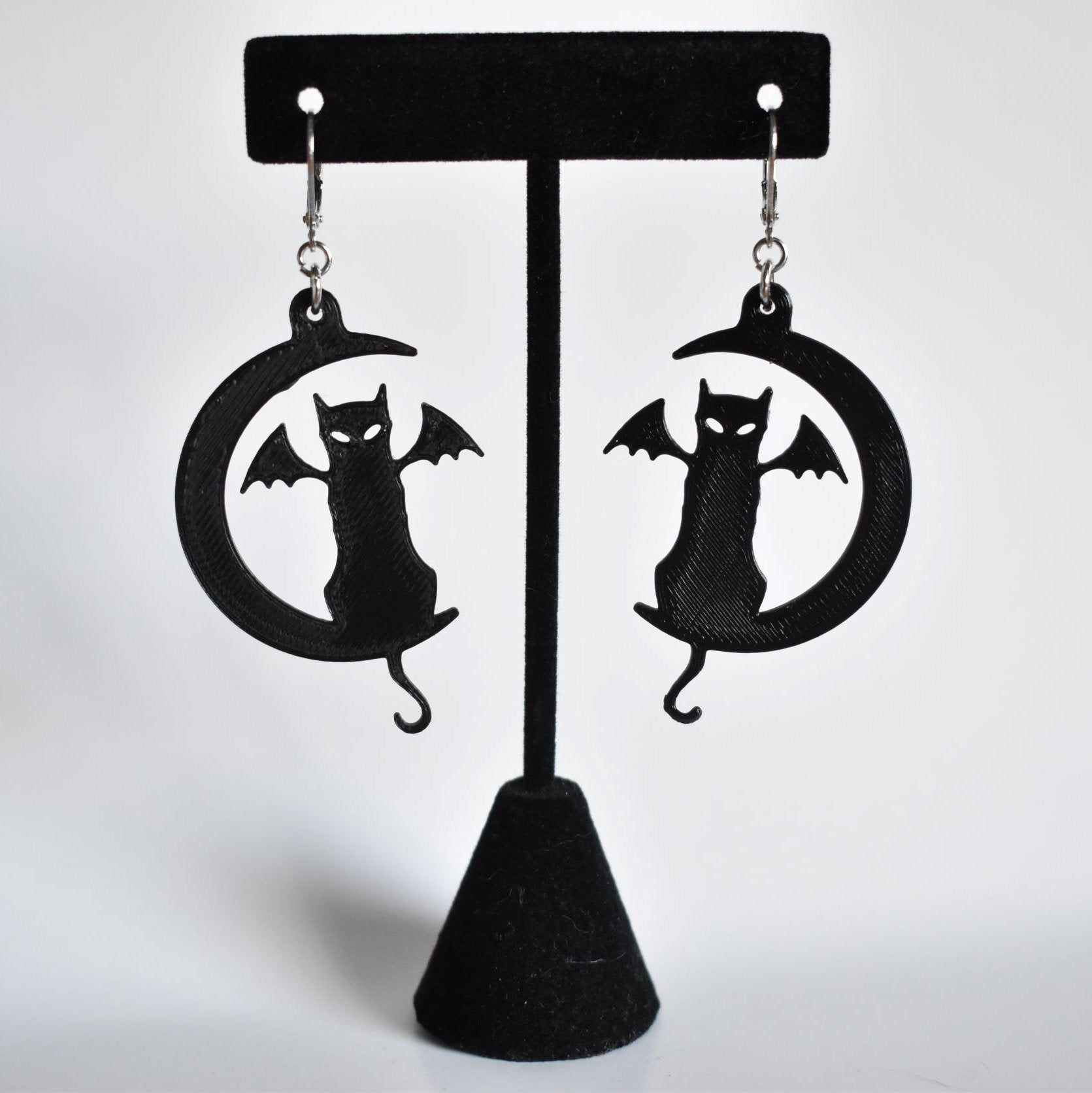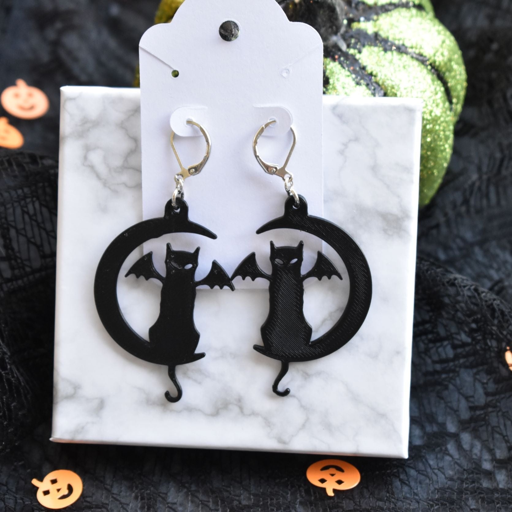 These black cat earrings feature intricate cat silhouettes with mesmerizing eyes, capturing the essence of Halloween night. Made with love and attention to detail, our earrings are the ideal accessory for cat lovers, witches, and anyone who adores the enchanting aura of All Hallows' Eve. The dangled cat and moon earrings are handmade and assembled after 3D printing. Material is PLA - a bio-degradable plastic resourced from sugarcane and corn.