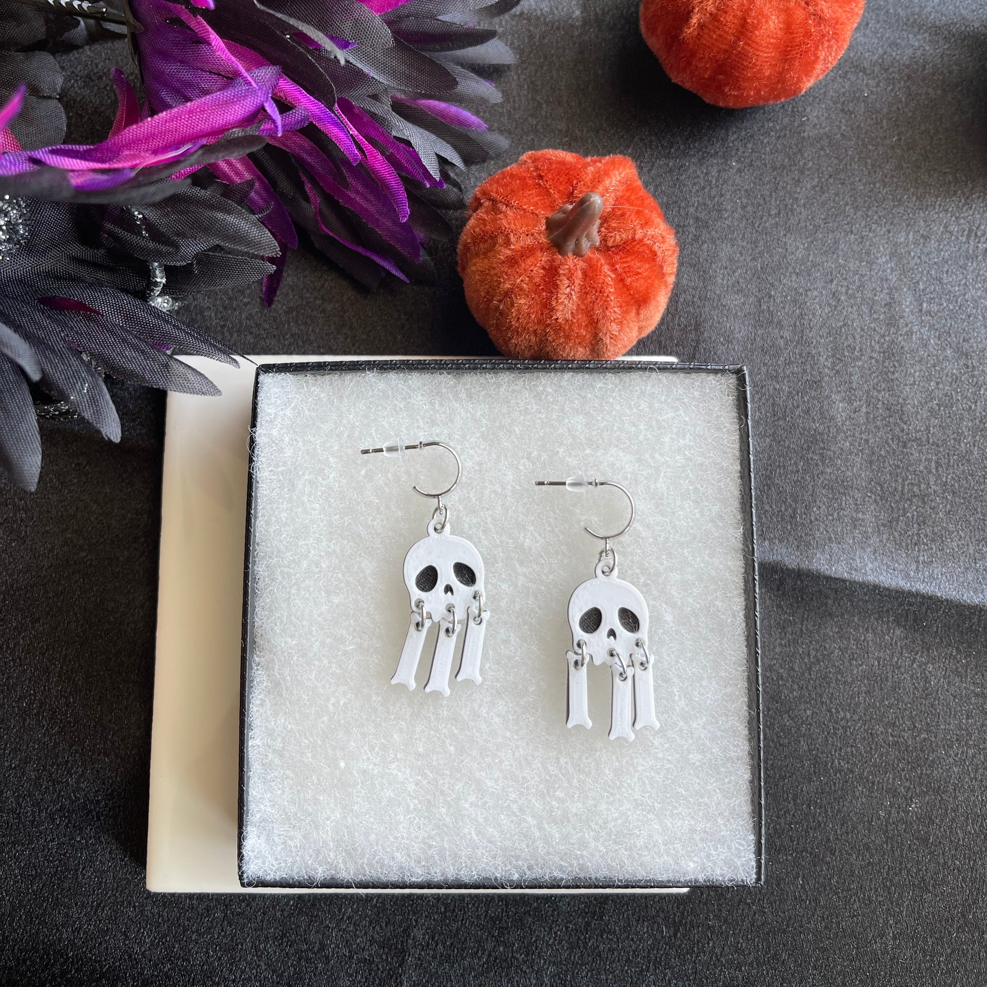 Playful and spooky all at once. These mini skull earrings feature dangling bone charms that move with you, bringing just the right amount of character to Halloween or gothic-inspired outfits. Each pair is 3D printed in lightweight, eco-friendly PLA and hung from rhodium-plated stainless steel or 18K gold plated half huggie studs. The huggies are nickel- and lead-free, making them a comfortable hypoallergenic option.