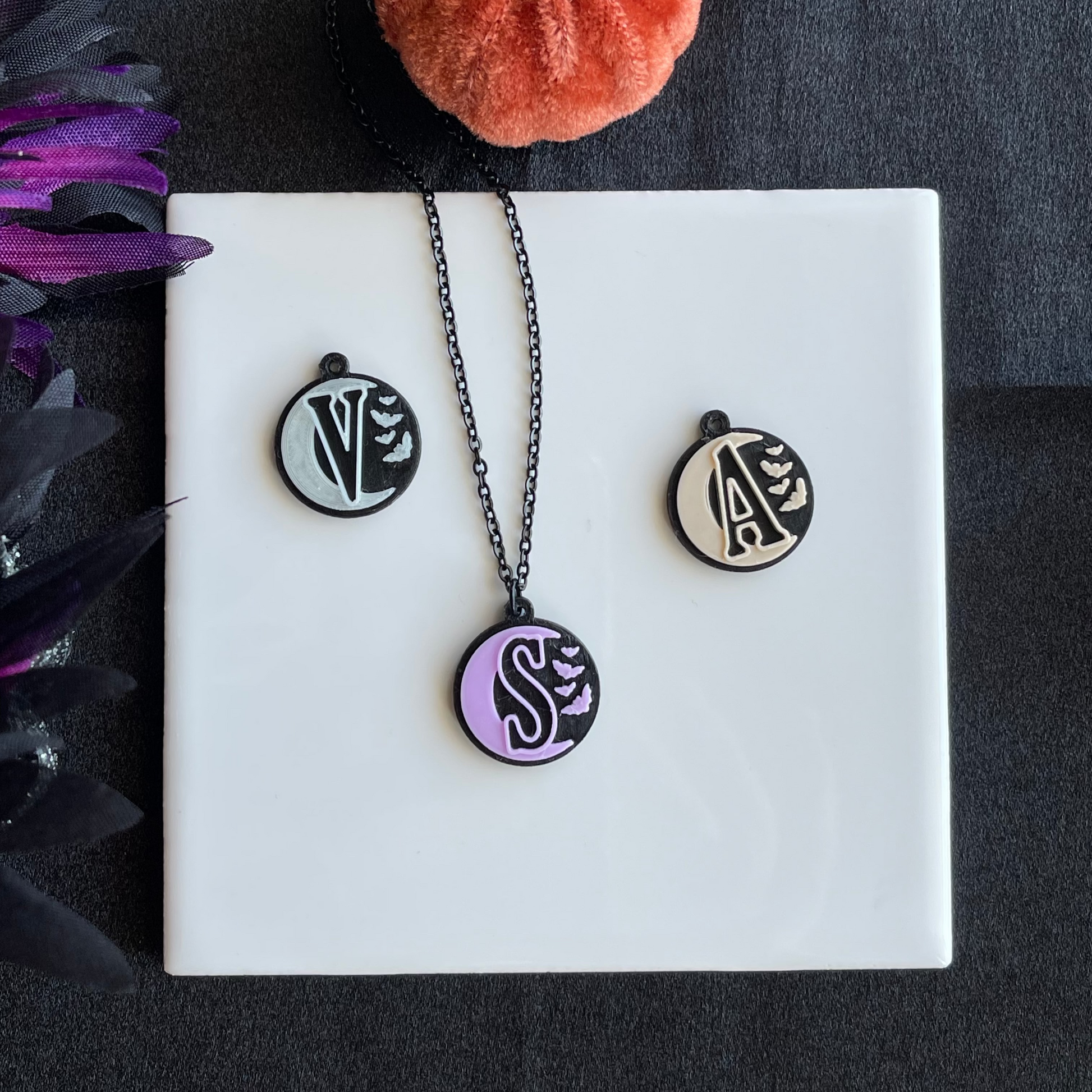 A personal touch with a spooky twist. This custom Halloween pendant features your chosen initial surrounded by tiny bats—available in three color options: black & purple, black & cream, or black & glow-in-the-dark. Each pendant is made from PLA, a biodegradable and eco-friendly material that's lightweight and durable. It comes on a 16" black stainless steel chain, perfect for everyday wear.