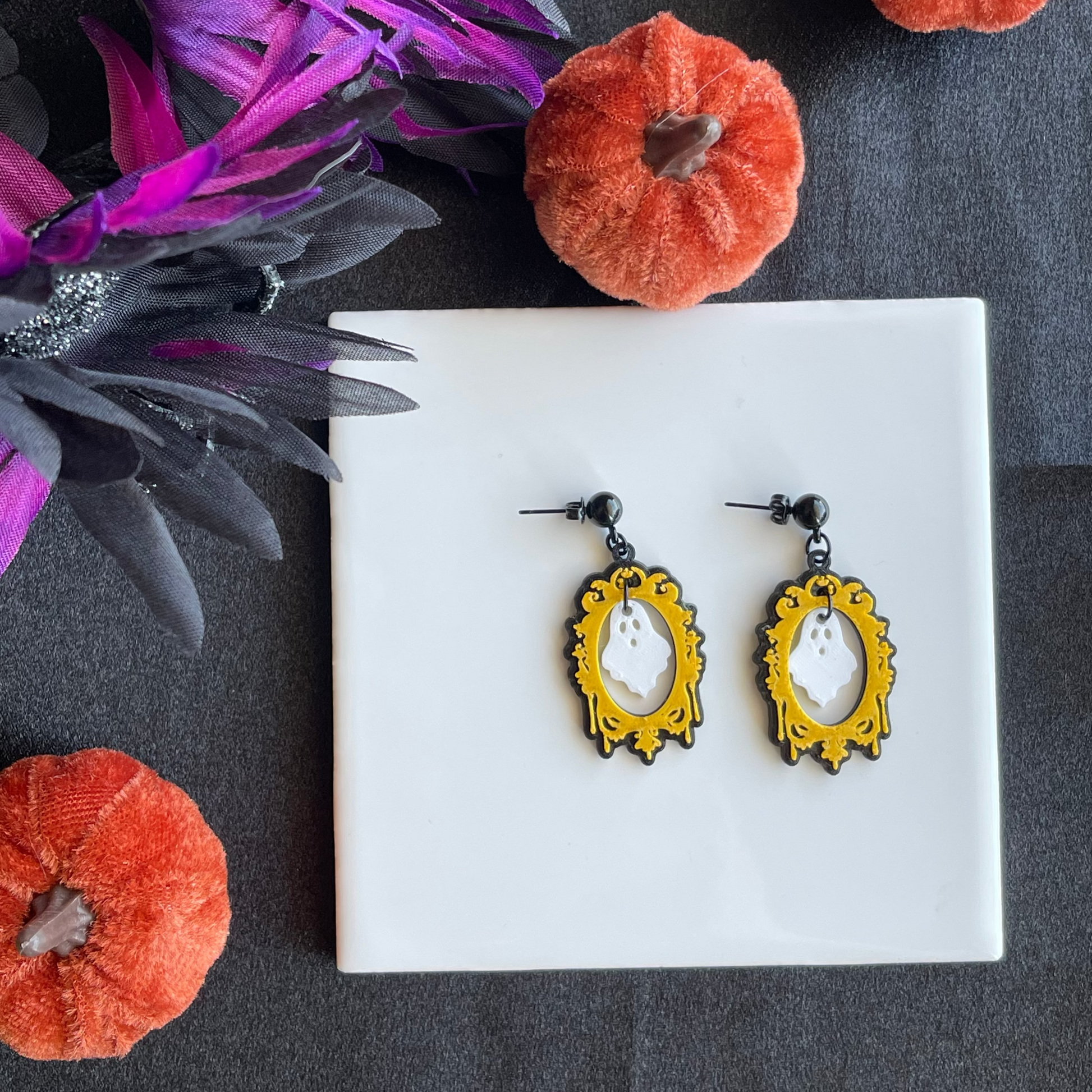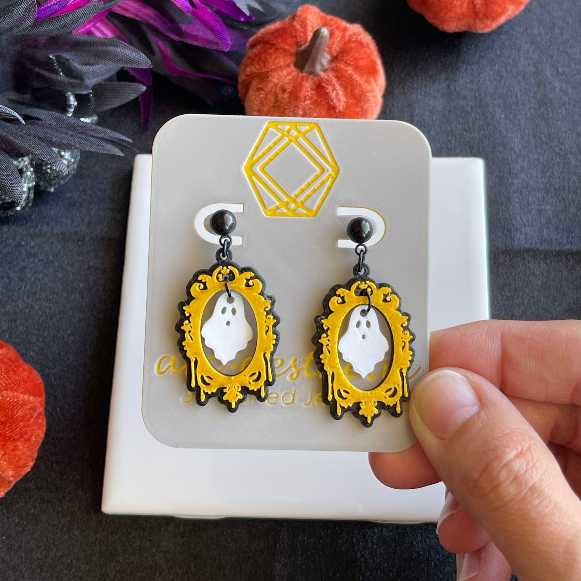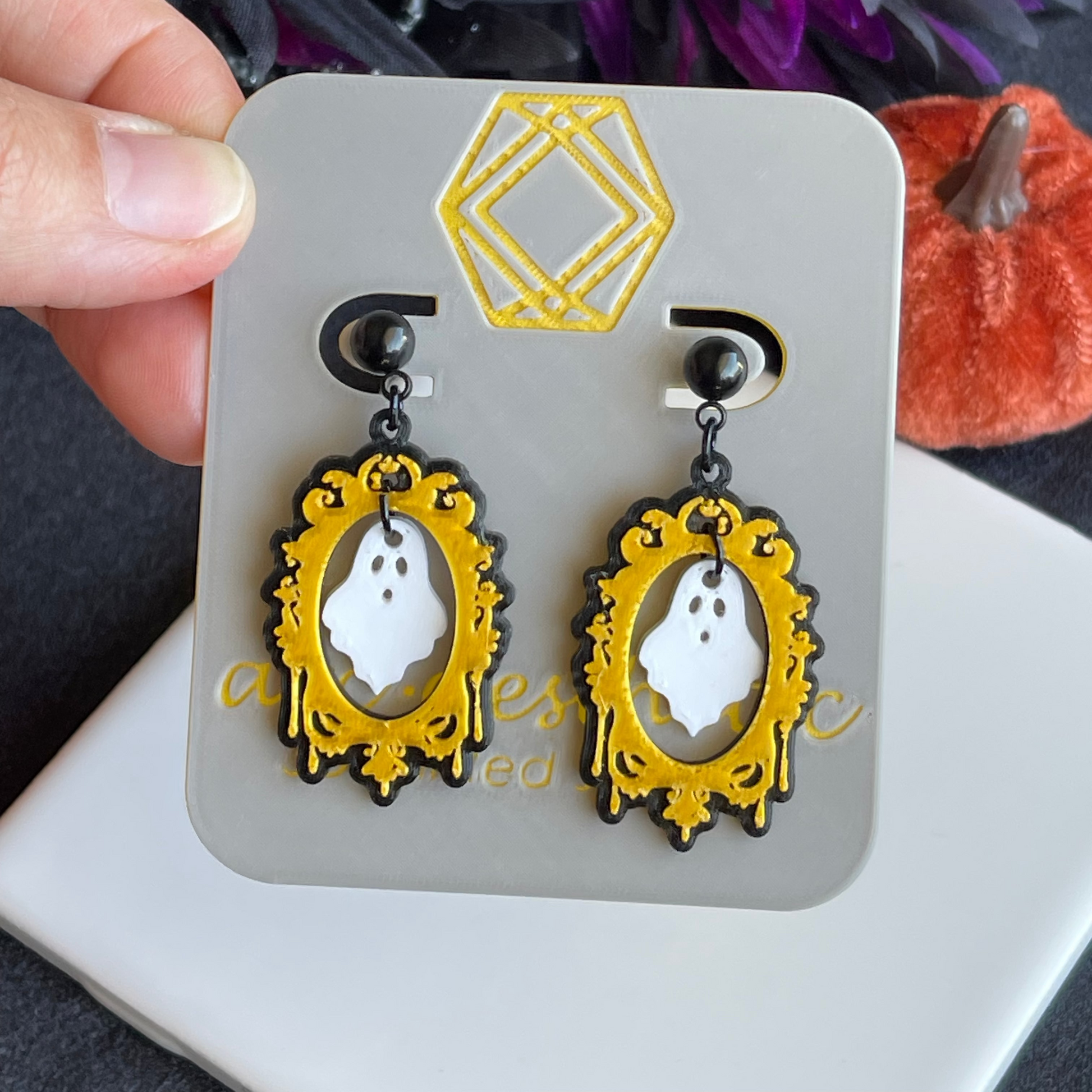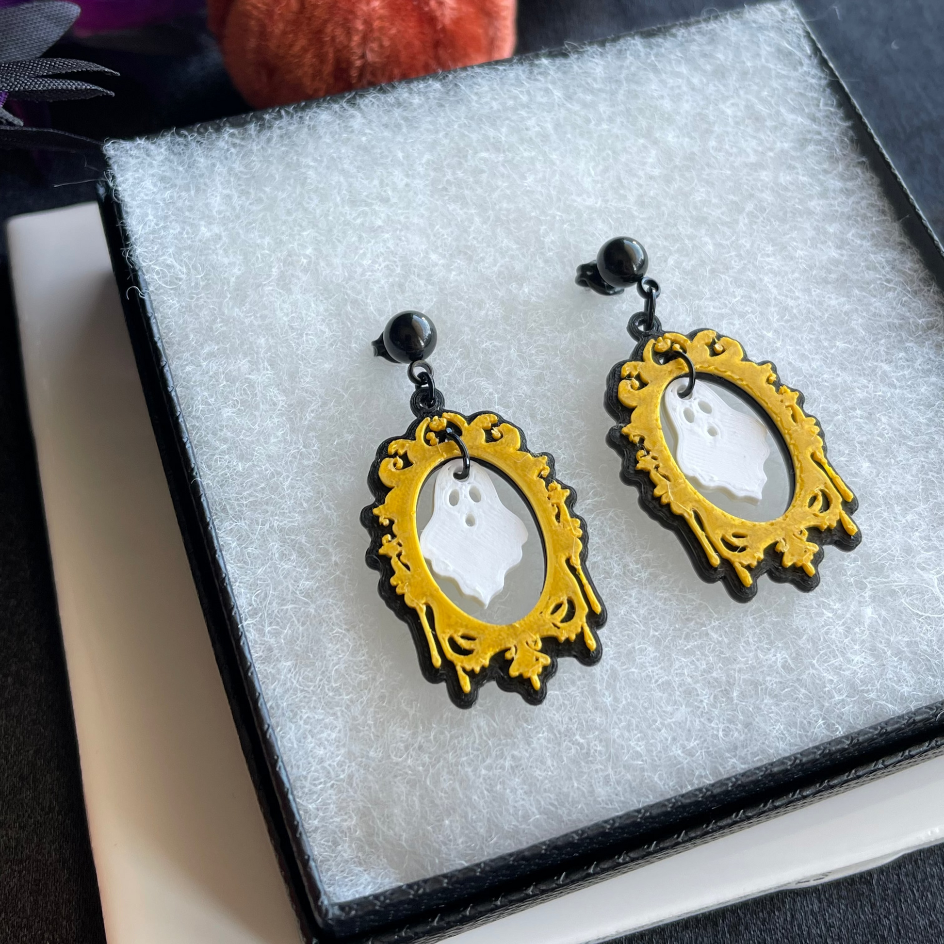 Haunted portrait gallery, but make it wearable. These ghost earrings feature a white ghost suspended inside a vintage-inspired black and gold frame. Made from PLA—an eco-friendly, biodegradable plastic that's super lightweight.