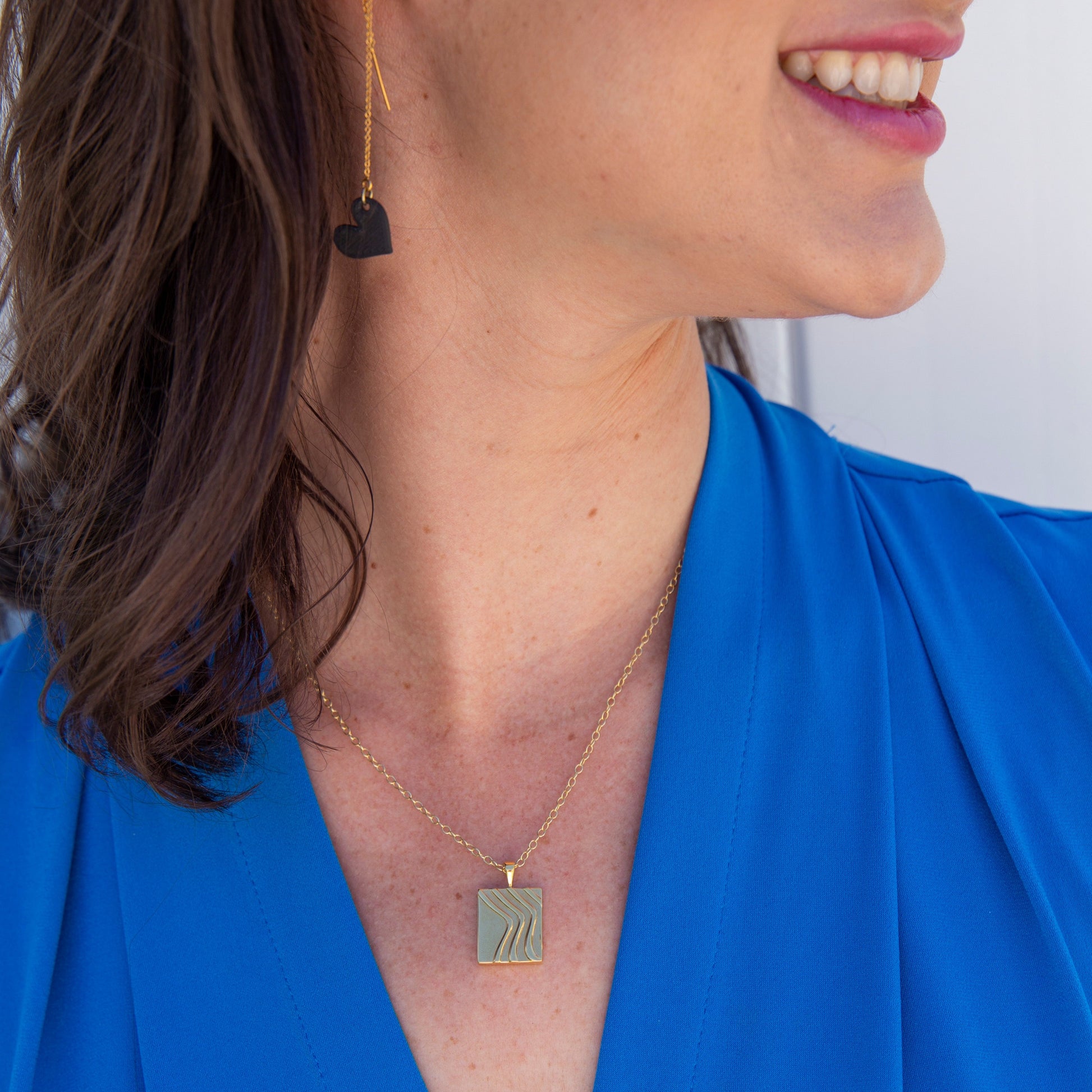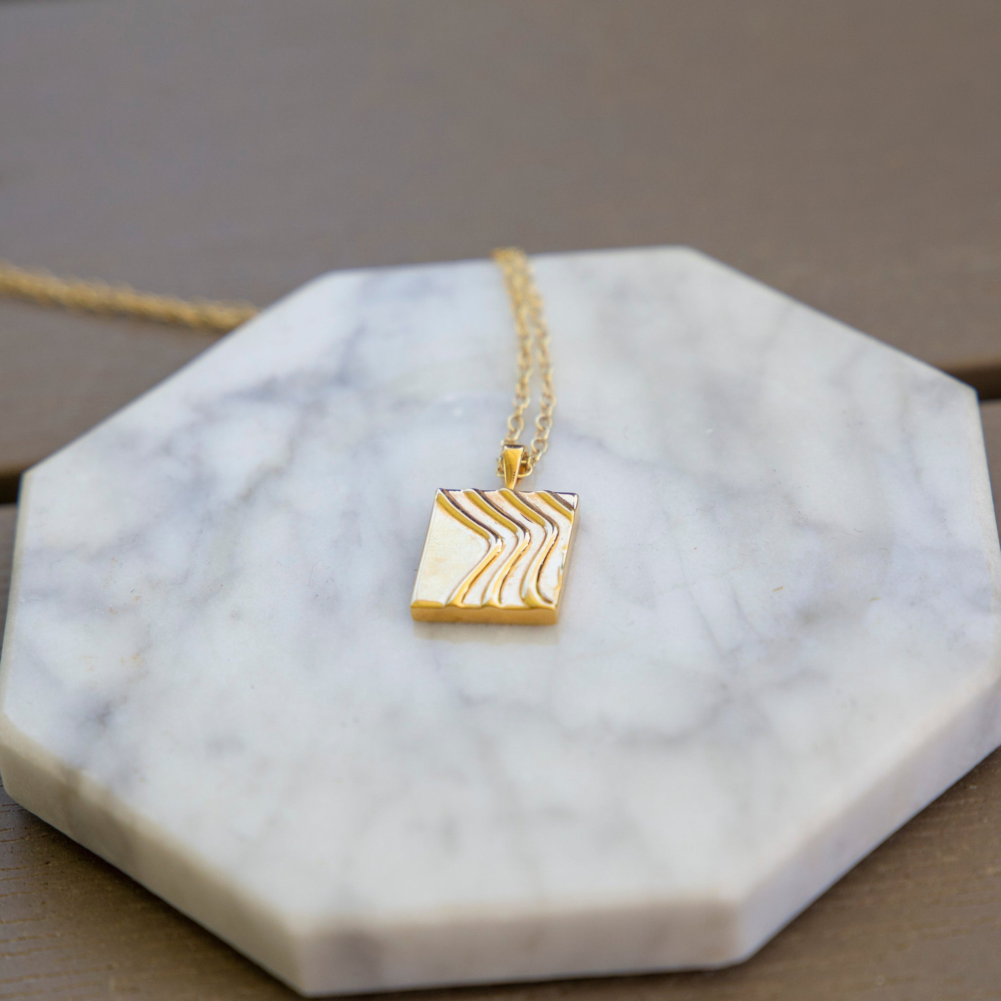 Delicate rectangular pendant with 3 dancing seams dancing across the front.